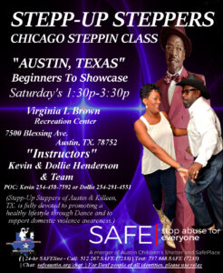 ATTENTION AUSTIN AND SURROUNDING AREAS, STEP YOUR WAY TO A HEALTHIER YOU IN 2021***** LEARN THE FASTEST GROWING URBAN BALLROOM DANCE IN THE COUNTRY, SMOOTH SEXY, CLASSY SWAGGER THE MEN ENJOY AND THE LADIES FINESSE. RIGHT HERE ON SATURDAY’S, CHICAGO STYLE STEPPIN IN THE STATE CAPITOL. OPEN TO ALL, YOUNG & OLD, THEIR FAMILIES, CHURCHES AND SOCIAL GROUPS. WEAR COMFORTABLE CLOTHES AND SHOES, NEXT CLASS ***** SATURDAY JUNE 2021 START TIME 1:30- 3:45PM WITH STEPP-UP STEPPERS OF KILLEEN & AUSTIN, TX. ….CLASS UPDATES COMING SOON !