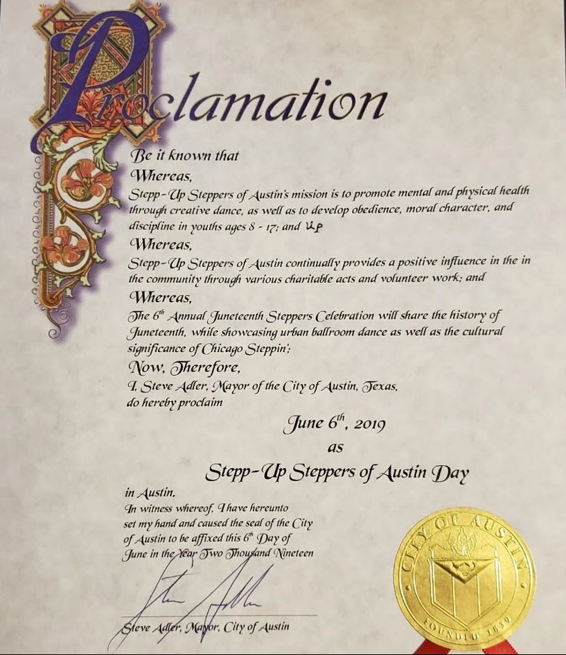 The Stepp-Up Steppers of Austin, Texas, received a proclamation from former Mayor Steve Adler. This recognition underscores the organization’s contributions to promoting healthy living and enriching the local community through Chicago Style Steppin’.